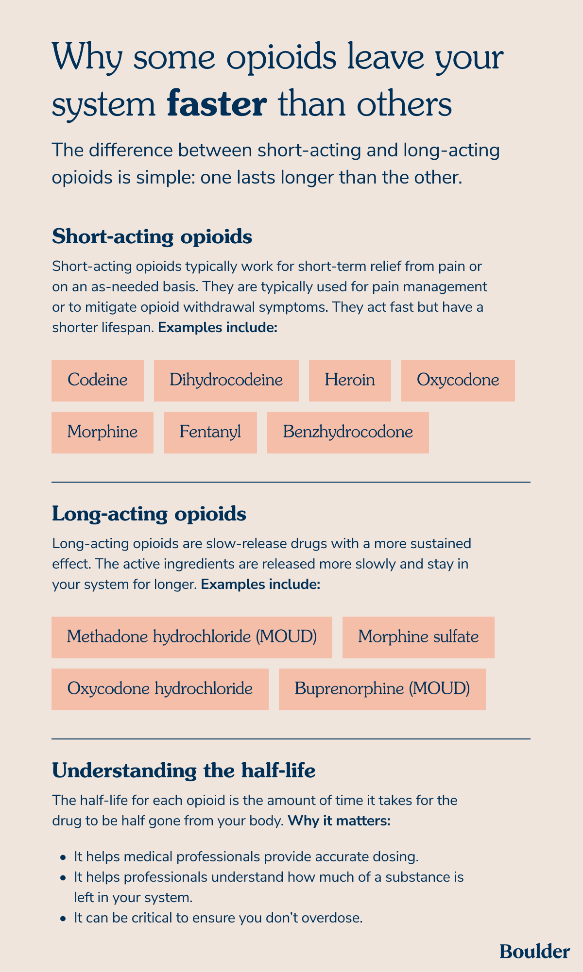Then there’s the half-life for each opioid—or the amount of time it takes for the drug to be half gone from your body. It can help medical professionals provide accurate dosing and understand how much of a substance is left in your system. Additionally, it can be critical to ensure you don’t overdose.