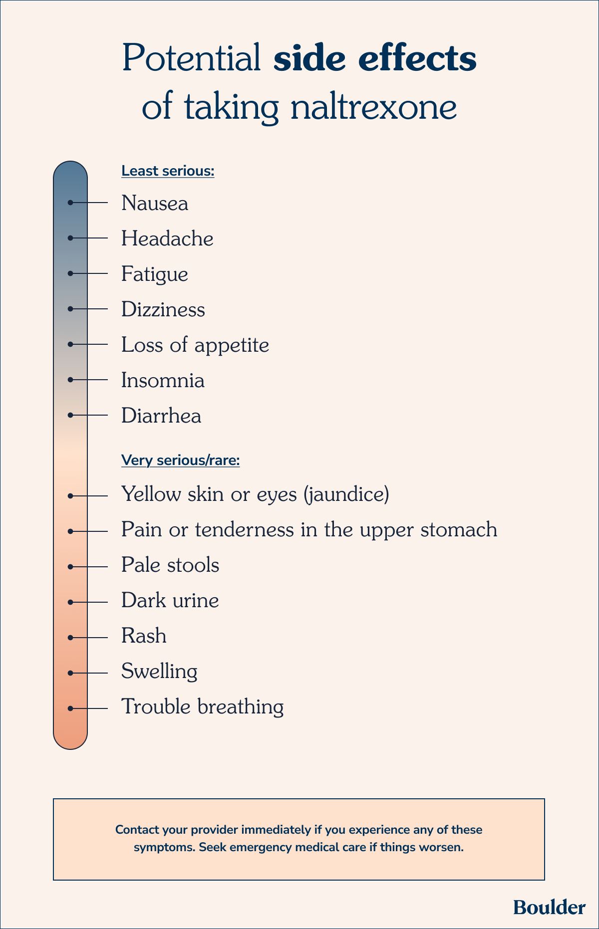 As you take naltrexone, keep in mind that some of its side effects will overlap with alcohol and opioid withdrawal symptoms, such as nausea, anxiety, and vomiting. Your provider should be able to help you distinguish between them.