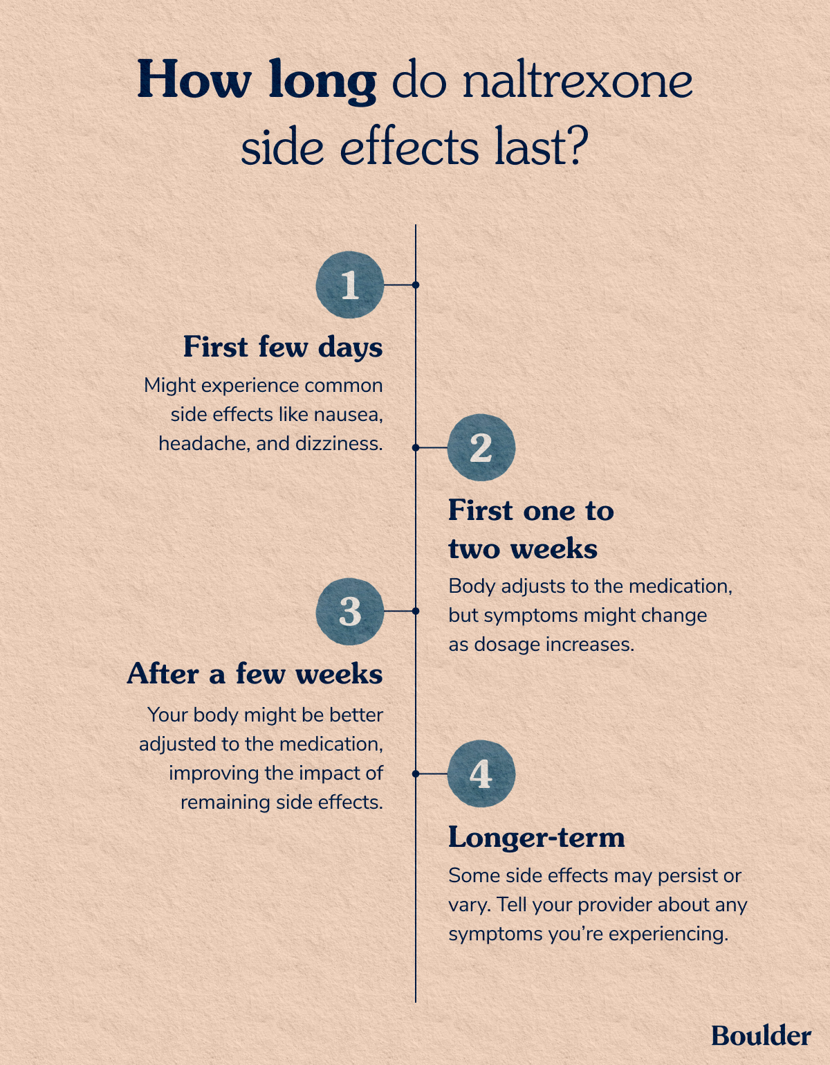 Your experience with side effects should improve as your body adjusts to naltrexone. “Most side effects from naltrexone improve quickly in a few days to a few weeks though sometimes headaches are persistent,” says Dr. Hull. Each person’s experience is different, but here’s a general idea of how long side effects last.